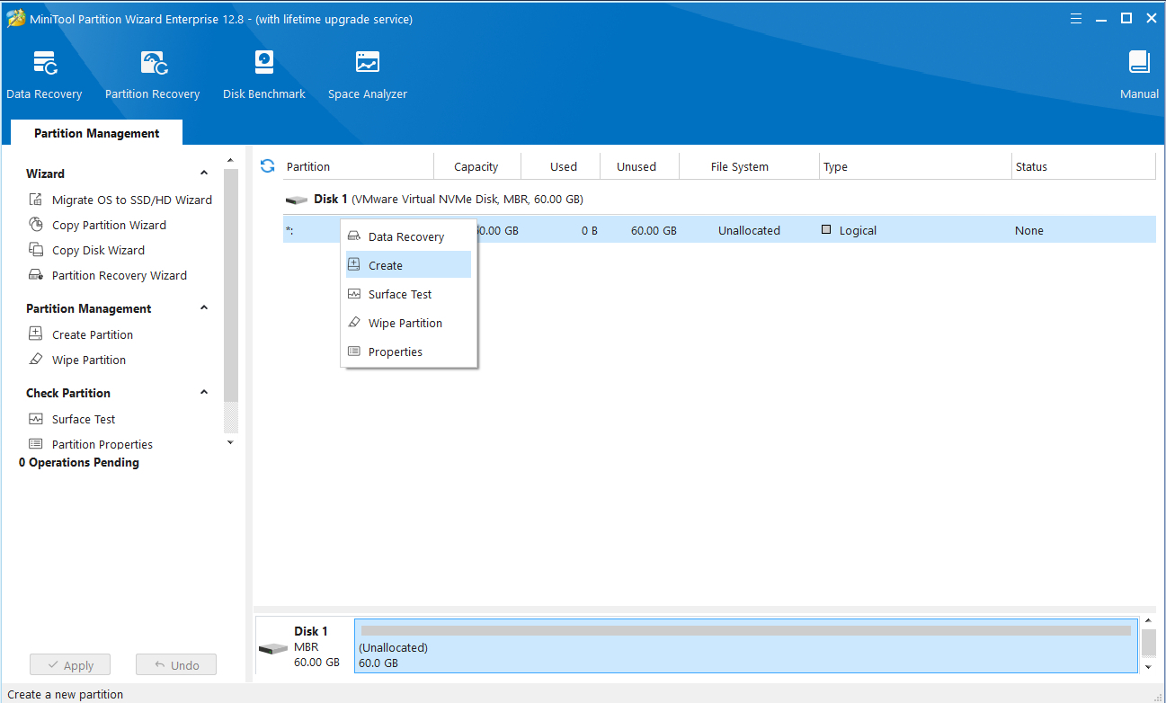 Như hình ảnh bên dưới là một ổ trống có dung lượng 60 GB. Giờ để tạo một ổ mới bạn nhấn chuột phải vào ổ đĩa cần chia sau đó nhấn chọn Create để bắt đầu.