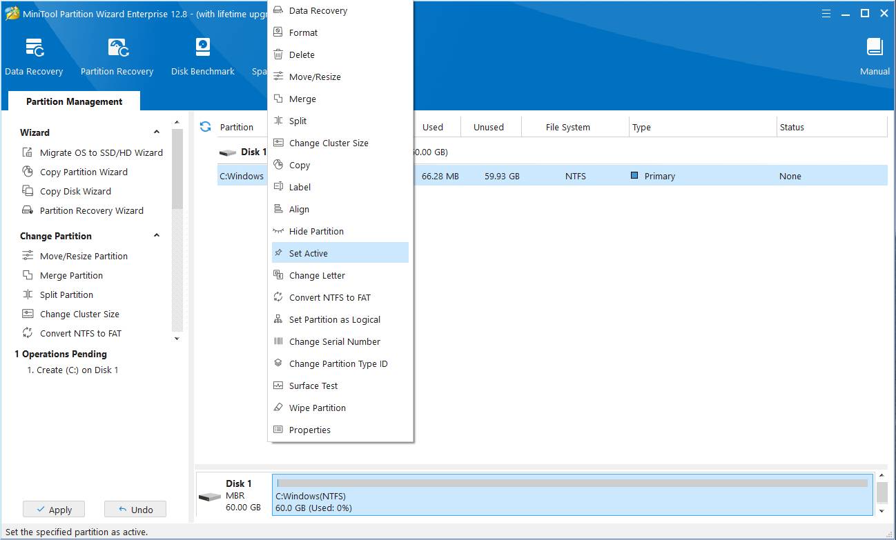 Ở dạng MBR chúng ta cần Active phân vùng cài Windows để khi khởi động máy sẽ nhận được đó là phân vùng khởi động. Chọn chuột phải vào phân vùng và chọn Set Active