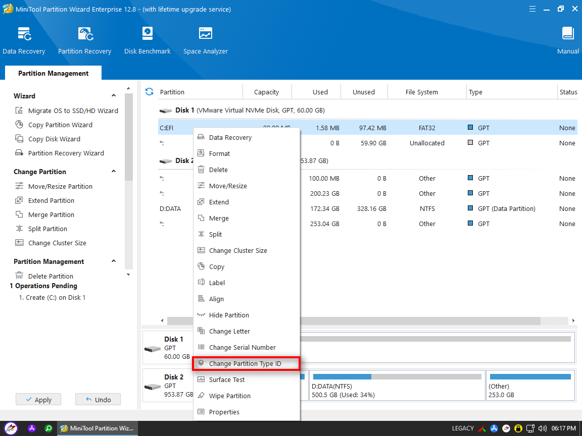 Change Partition Type ID phân vùng EFI, chọn EFI System Partition (ESP)