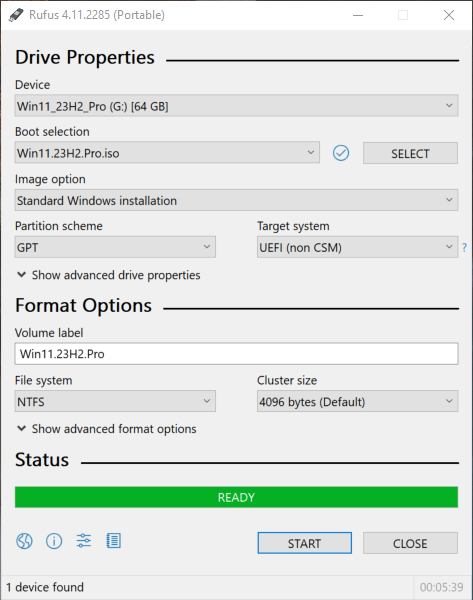 Trong Image option, bạn chọn Standard Windows installation, trong Partition scheme thì chọn MBR hoặc GPT tùy thuộc máy của bạn hỗ trợ BIOS hay UEFI. Mục File System, hãy để là NTFS, sau đó nhấn Start để bắt đầu.
